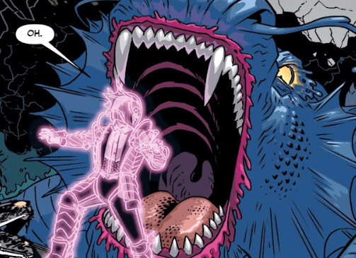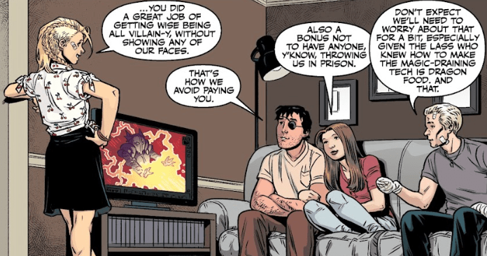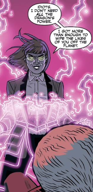 Watching the dragon reel in pain, fiery orange light burning across its scales, Willow Rosenberg stares at the creature and wonders aloud if she caused it. Lightning streaks around her. The dragon roars in agony. Willow looks down and sees the orange beam draining the creature of its magic — and it’s coming from Pandora.