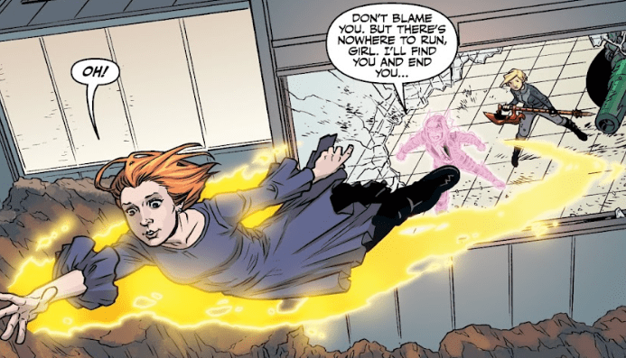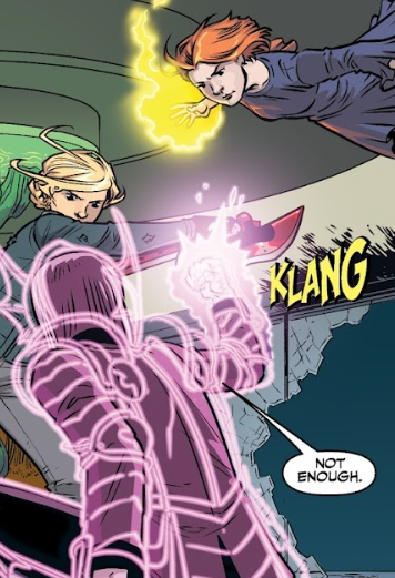“And a grouchy witch,” Willow says, appearing out of nowhere above them. She fires flame at Joanna, sending her stumbling. Buffy swings the Scythe. Joanna suddenly finds herself fighting off both Slayer and witch, her field barely holding.
