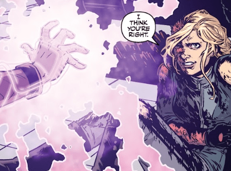 “Of course, the big question is… then what?” Wise sneers. She kicks the Scythe away and lifts Buffy by the collar. Buffy’s right side is smoking, her hair charred, her skin burned and bruised.
