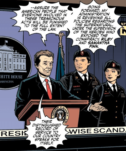 “Going forward, my administration is reviewing all policies regarding the supernatural, under the supervision of the heroes who exposed the conspiracy — Riley and Samantha Finn.”