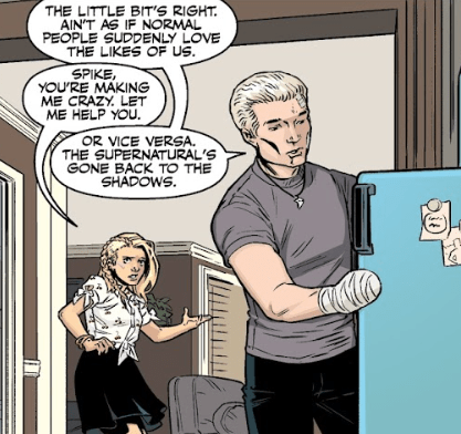 Spike, hands heavily bandaged, struggles to open the fridge. Buffy has cut her hair around the burned portion as best she can — she looks almost punk rock, and she’s decided she’s rocking it. She tells Spike he’s making her crazy and moves to help him.