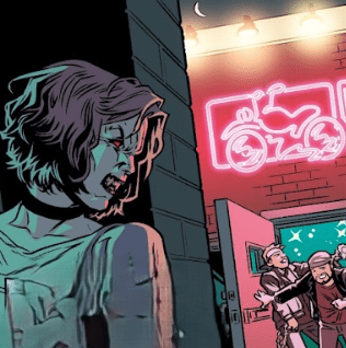 On a busy downtown street, a nightclub opens its doors. By the end of the evening, chaos has ensued inside and the bouncer opens the door with a clang. He throws two drunken frat boys out of the club and they stumble along the sidewalk. Watching from the shadows is Vicki the Vampire.