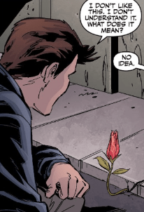 Suddenly they’re on the street below. Illyria has warped them there so fast Angel didn’t register the movement. She’s staring down at a red flower — the same one from his vision — growing out of the concrete.