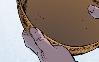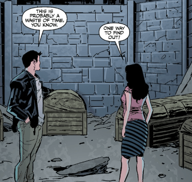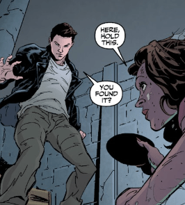 She hands him a small circular object, thick with dust. Angel wipes it clean, unsure if it’s even what they’re looking for.