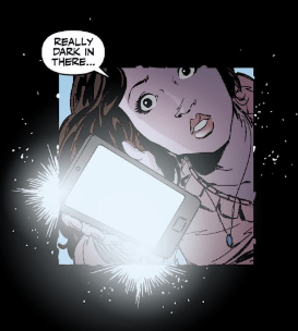 She’s collapsed. Eyes open. Hair shifting colour. Blue energy crackling at her fingertips. Pupils glassy.
