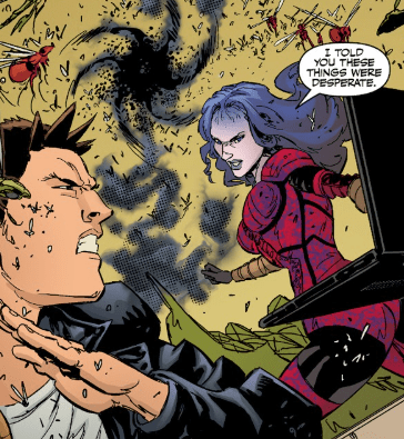 Angel doesn’t answer. He’s staring at the dimensional tear. An insect crawls out of it.