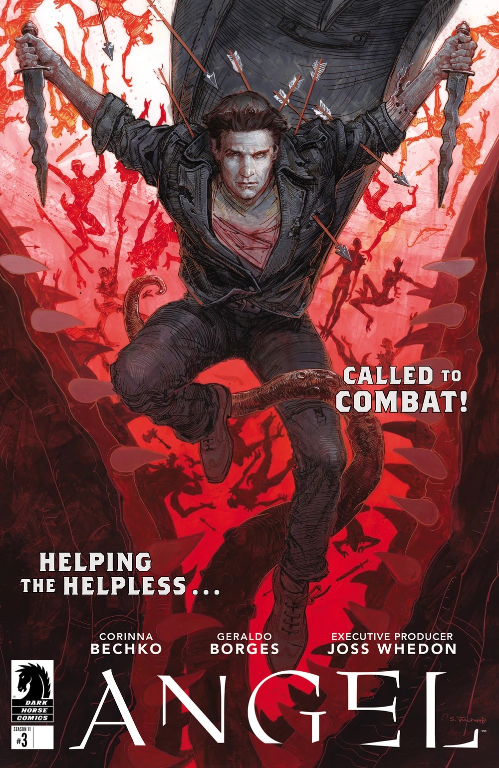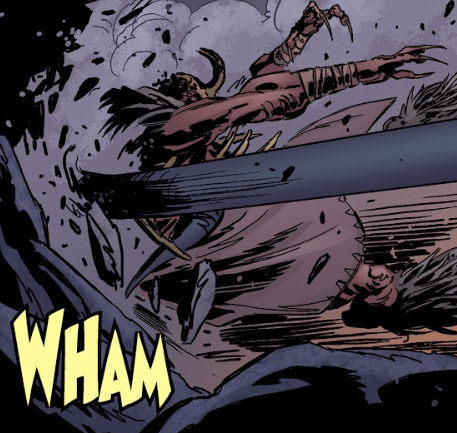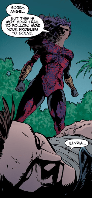 Angel dives and knocks her out of the way. He calls to their companion, the tribal demon he calls Swal, but can’t reach him in time.