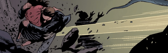 “We have to get away from here,” Angel says, lifting Illyria and running. He glances back at the two giants, now quarrelling.