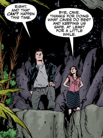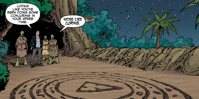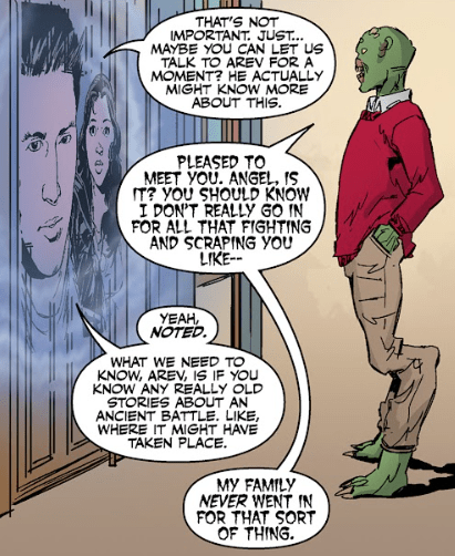 Arev approaches the hole and peers in, wearing a red sweater that compliments his green skin. Angel finds it strange to see clothing on one of the tribe. Arev explains that his family were pacifists.