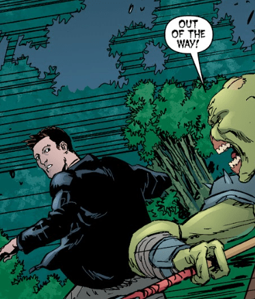 Angel doesn’t wait. He’s already sprinting through the foliage, heading toward the battle. The demon leader yells after him.