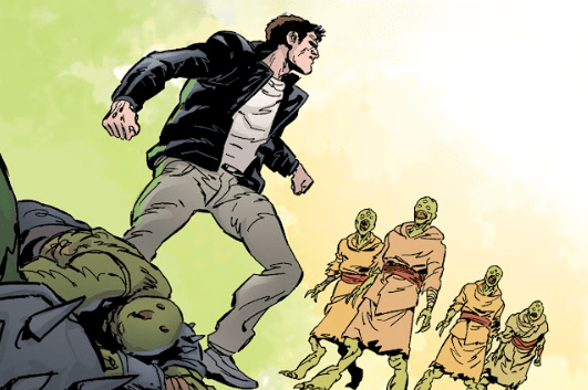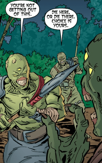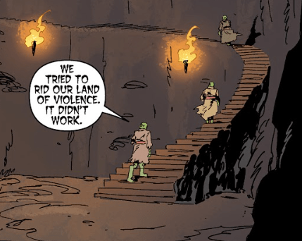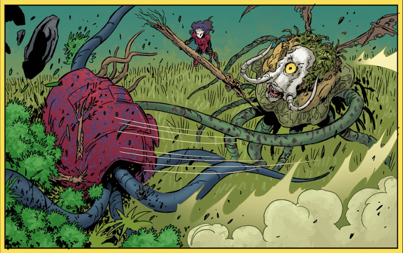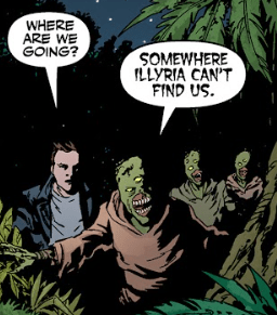 Angel rises slower than he’d like. He heads in the Old One’s direction, following the destruction she leaves behind. In a clearing, he’s nearly trampled by more demons — green-skinned, three-eyed, wrapped in colourful rags that once were tunics. One urges him to join them.