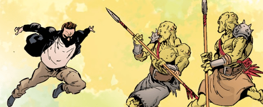 “You’re not getting out of this!” one with a spear yells.
