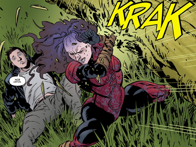 Seconds later, the Old One Illyria crashes into the ground a few metres away, missing them by inches. Angel doesn’t hesitate. He scoops Fred up and runs.