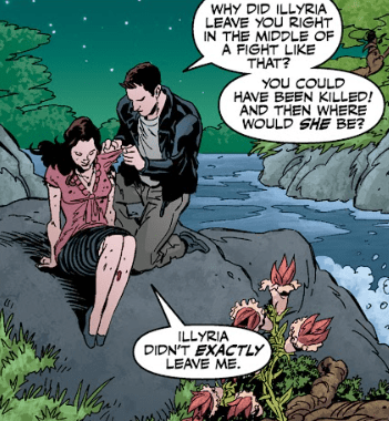 “Maybe you better let me take a look at that,” Angel says, gently steadying her as he prepares to clean the cut. “Why did Illyria leave you in the middle of the fight like that? You could have been killed! And then where would she be?”