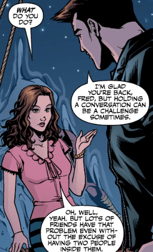 Fred sighs and shrugs. “Oh, well, yeah. But lots of friends have that problem even without the excuse of having two people inside them. Is this where you wanted to go?”