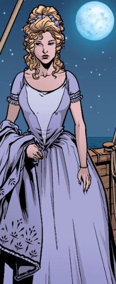 A woman comes out onto the deck, admiring the full moon. She wears a long, wealthy gown — clearly someone of import. Her long blonde hair is styled up with a purple ribbon, matching the colour of her dress.