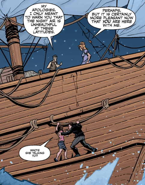 The deckhand has gone further than he thought possible. He’s now far up above the ship, on the crossbeams holding the sail in place. Angel whispers at him. “I wouldn’t yell if I were you unless you want a short trip back to the deck.”