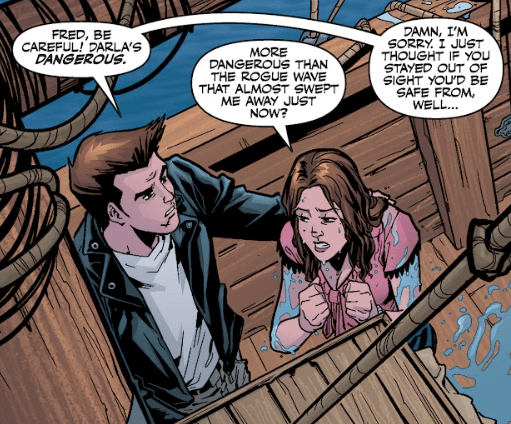 As the pair move off, Angel nearly jumps out of his skin in fright when someone taps his shoulder. He’s surprised to find Fred, soaking wet and not looking amused, clinging to the rail and trying to clamber back aboard.
