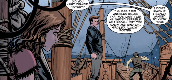 Angel raises his hand and reassures her, calming her. “It was a stroke of luck for Darla and Angelus. This ship sank and presumably the bug with it. We got away on the pirate ship. Didn’t do the pirates good.”