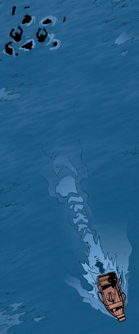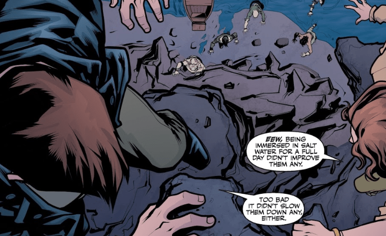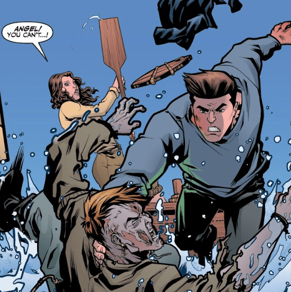 “Angel, you can’t!” Fred yells in alarm, both for her friend and the idea of being alone on the ocean. She can already see his face starting to blister. He punches the zombie twice in the water and then disappears under the surface.