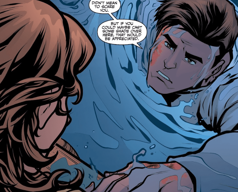 Fred shields him with her body as she stretches, reaching for the barrel shield. “That looks really painful.” She holds the shield over his head the best she can, with Angel staying in the water.
