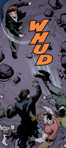 “Too bad it didn’t slow them down any either,” Angel says. He and Fred turn and find a big enough boulder and then proceed to push it together down the way they came, hitting the zombie crew back to the bottom.