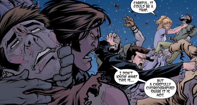 Angel sees his counterpart and picks up a zombie. He throws it at the other zombies holding Angelus. Angelus is surprised by his other self’s actions.