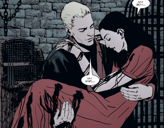 In the torture chamber, Drusilla’s mind finally slipped into a catatonic stillness, her body limp in the inquisitor’s chair. Believing she had broken, he paused — just long enough for Spike to arrive. Spike ripped the man apart without ceremony, blood splattering across the stone walls. Then he lifted Drusilla from the chair, cradling her as though she were made of glass, whispering to her as he carried her out into the night.