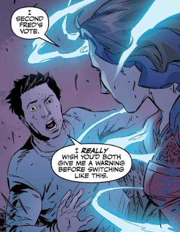 And with that, Fred is gone, swallowed in blue light as the Old One Illyria now stands in her place.