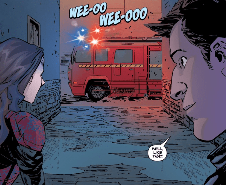They materialise in an alley, filthy and dark. They hear sirens in the distance. It’s almost enough to convince Angel they’re home, but he would like to see more modern evidence. He gets it when a fire engine roars past on the main street.