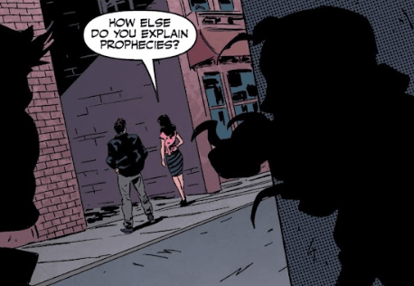 Peering across the street, they see Angel and Fred, their earlier selves, inspecting the alley across the street. Illyria and Angel listen in on the conversation. Angel bristles as they walk off.