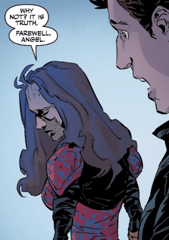 “Why not? It is the truth,” she states coldly. Without looking at him she bids him goodbye. “Farewell, Angel.“