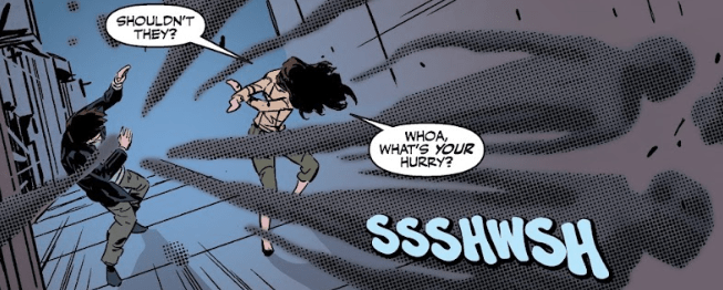 Angel thinks they need to have a closer look, and they emerge fully into the street. Suddenly Illyria yanks Angel by the collar and pulls him back into the shadows. As he turns to ask her what she’s doing, he hears Fred’s voice across the street.