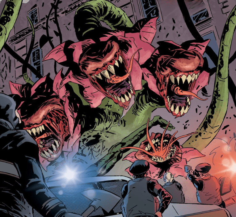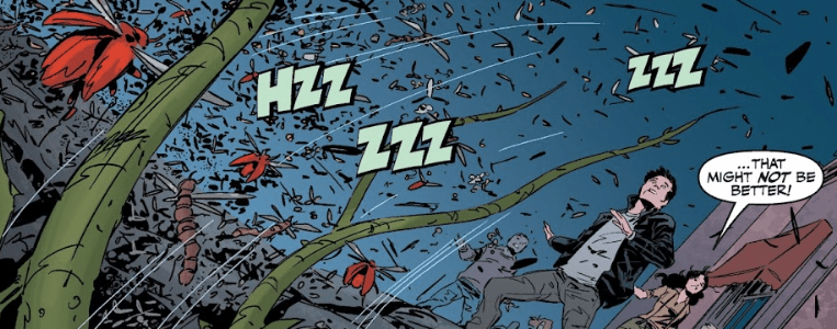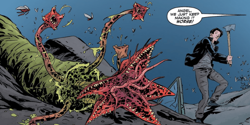 Angel looks down at where he sliced the vine. He’s stunned by what he sees. More buds have sprung from it, with more teeth and more beetles emerging.
