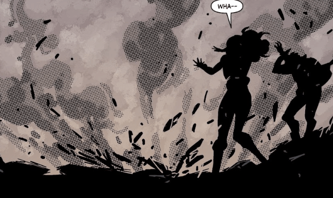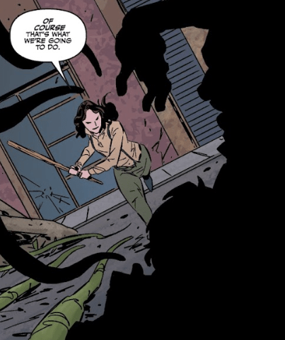 There’s nothing left of the hotel. It’s buried under debris as a raging plant grows out of control. It’s the same red flower they saw in the alleyway their first night here. Except now it’s bloomed — the size of a house — and makes Little Shop of Horrors look like a nursery tale.