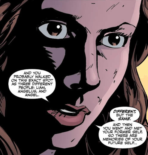 Fred shakes her head. “I don’t mean, like, philosophically. I mean literally. You’re already an unusual type of person. Dead, but alive. Vampire, but with a soul. And you probably walked on this exact spot as three different people: Liam, Angelus and Angel. Different but the same. And then you went and met your former self, so there are memories of your future self.”