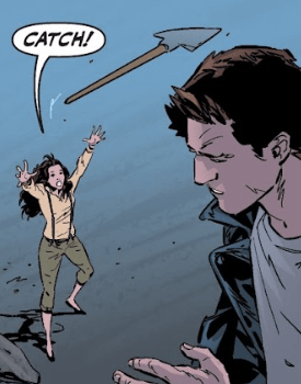 “Angel, be careful!” She gets his attention and tells him to catch the spade. He does, and uses it to break himself and civilians free as more vines exude from the ground beneath them. He hears Fred call his name.