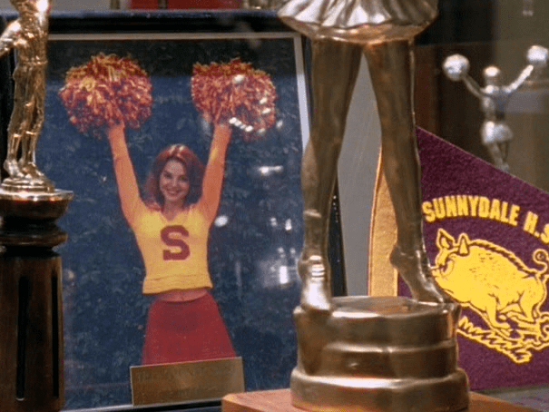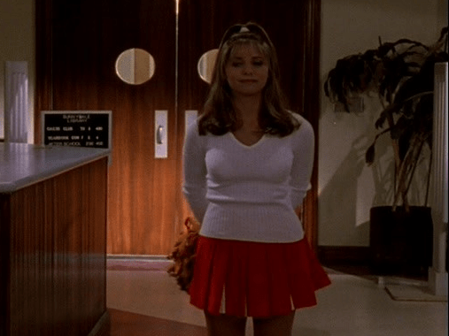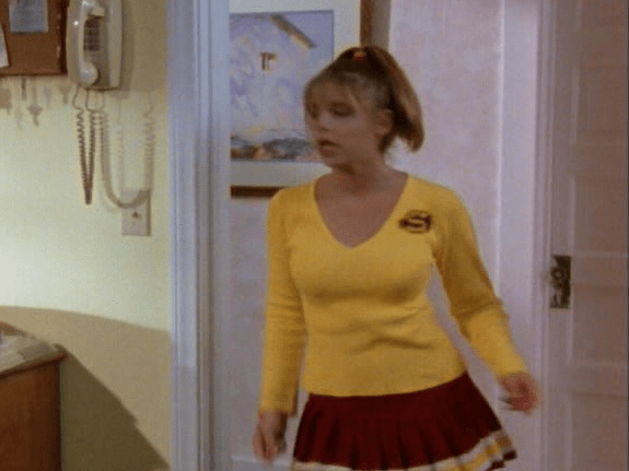 0:32 : Our first glimpse of Buffy in a cheerleading uniform – but it’s not the one for Sunnydale High. This one could be her old one from Hemery, but it’s not Sunnydale colours.