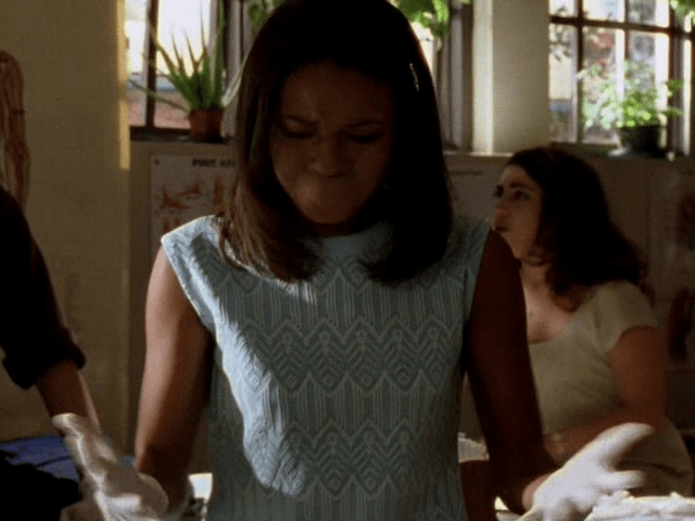 24:18 : Lishanne’s mouth disappears in the middle of class, and the group decide that Amy is their witch – despite her shock at Lishanne’s trouble. Clearly this is an act here, designed to throw Buffy off the scent.