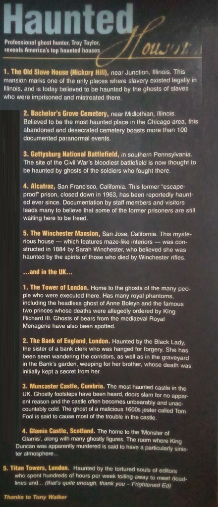 A real life look at hauntings and spirits. An interesting article, one that defines an apparition as a ‘supposed disembodied spirit of a dead person, appearing as a pale, shadowy apparition.’ Spooky. It also lists the five most haunted places in the US and in the UK – including the idea the the magazine offices themselves were being spooked by a malignant force…