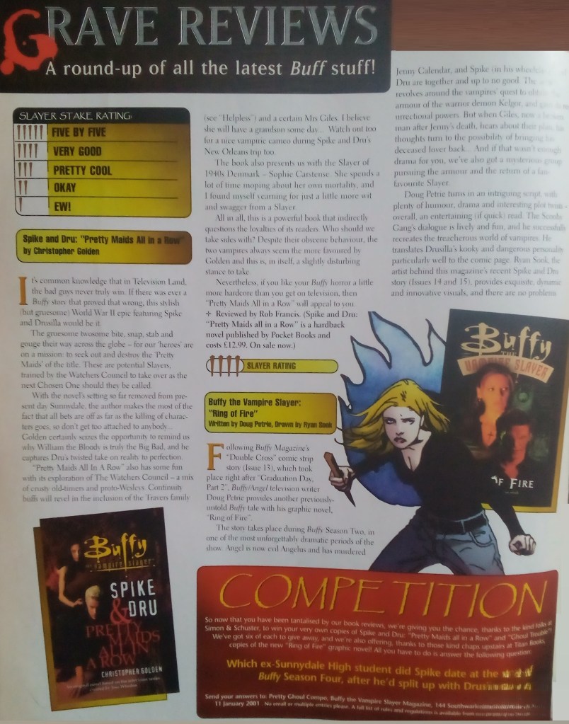 A new section for the magazine, reviewing all the latest merchandise. This issue reviews Spike and Dru: Pretty Maids All in a Row by Christopher Golden and the graphic novel Ring of Fire.