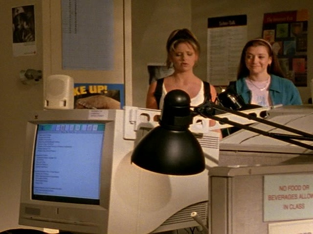 7:00 : This is the first time we see Jenny’s computer classroom, which is now a part of the permanent Mutant Enemy high school set. Note the double entrances to the room, which will be important in Passion. It’s seemingly a different computer lab than the one Cordelia and Willow were in during The Harvest.