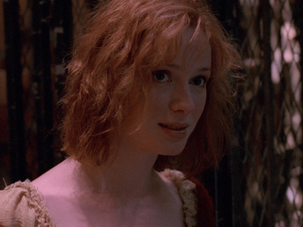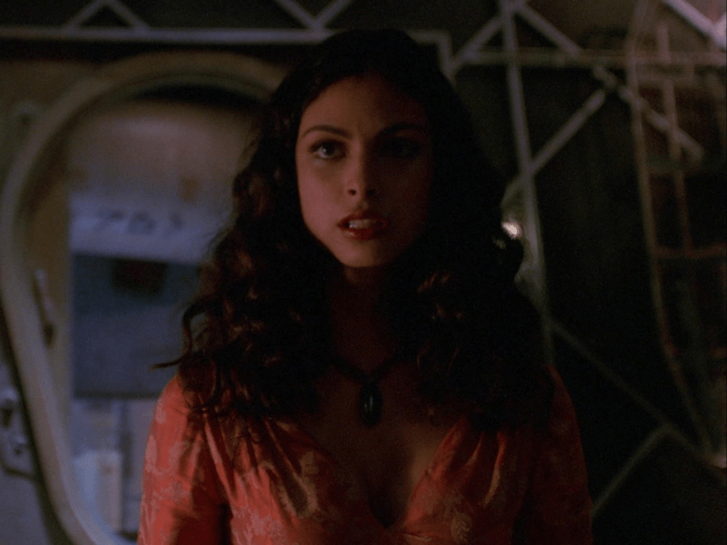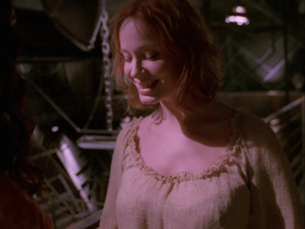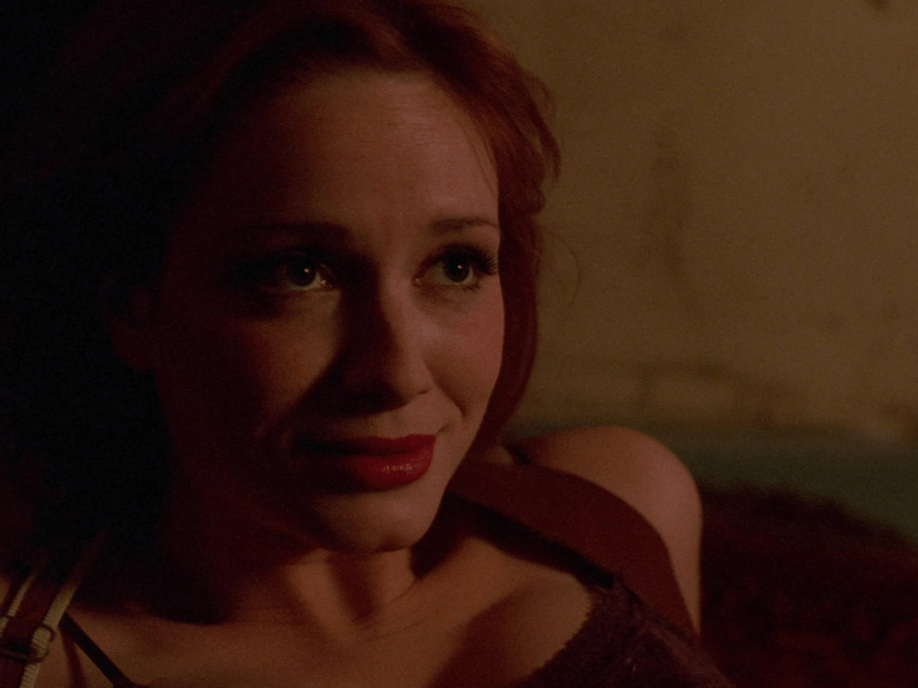 3:35 : Christina Hendricks makes her debut as Saffron in this episode and is instantly memorable. More from Saffron would have been so much fun. Hendricks had previously appeared, in an early television role, as a barmaid seduced by a pre-vampire Angel in The Prodigal. She would go on to critical acclaim and success with her role as Joan Harris on Mad Men.
