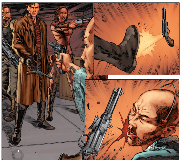 He says he wants Mal’s gun — that gun, the one that rode with him through the War. Mal don’t take kindly to that notion. He kicks the piece straight into O.T.T.’s jaw, and the world erupts in gunfire.