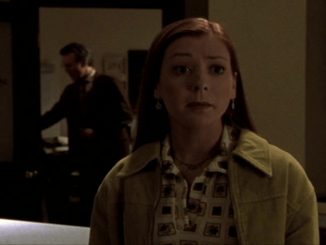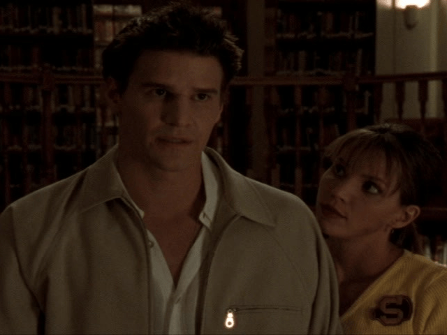 8:54 : In a lovely moment that’s easily missed, after Cordelia asks if they can deal with her pain, Giles pats her on the back with a barely sympathetic “There, there.” Of course, quite why she’s in the library other than for their sympathy is anybody’s guess.