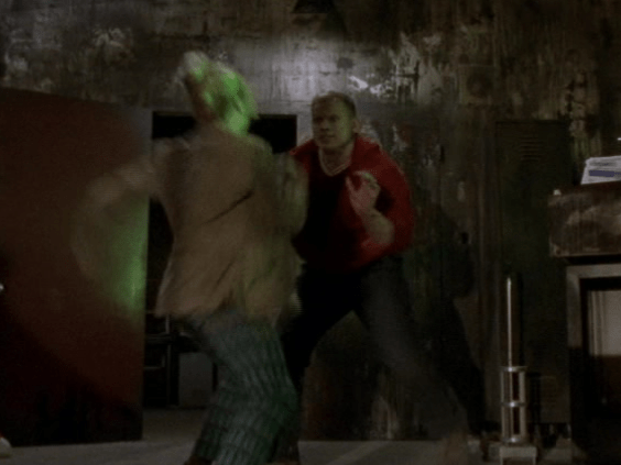 37:56 : Eric throws a knife straight at Buffy’s head and she catches it effortlessly. This is similar to a scene in the original 1992 movie where Merrick tests Buffy the same way: “You threw a knife at my head!” / “And you caught it!” It’s a line that was also immortalised in the film’s trailer.