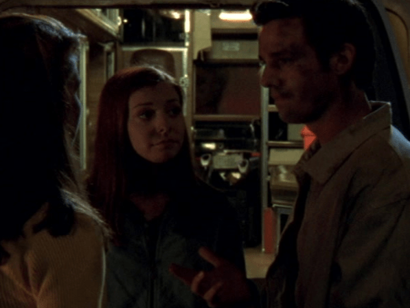 13:51 : Note Angel inadvertently showing his jealousy by wearing a lighter colour jacket, more like Xander’s than his. He looks bad in white.