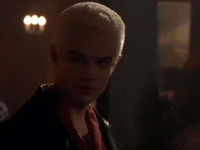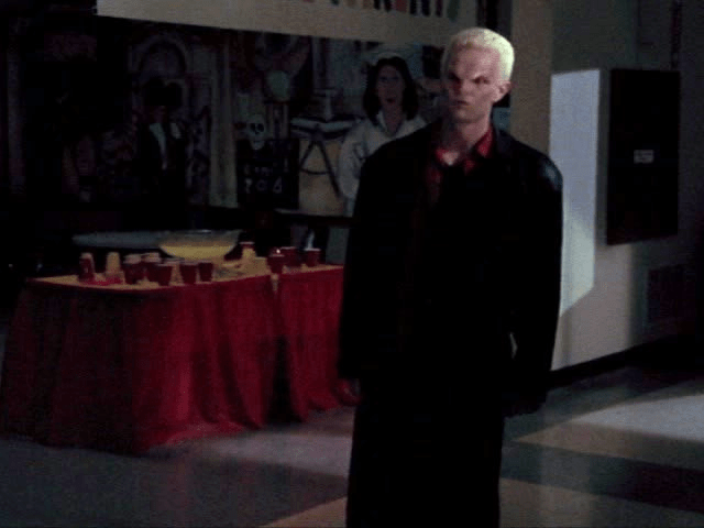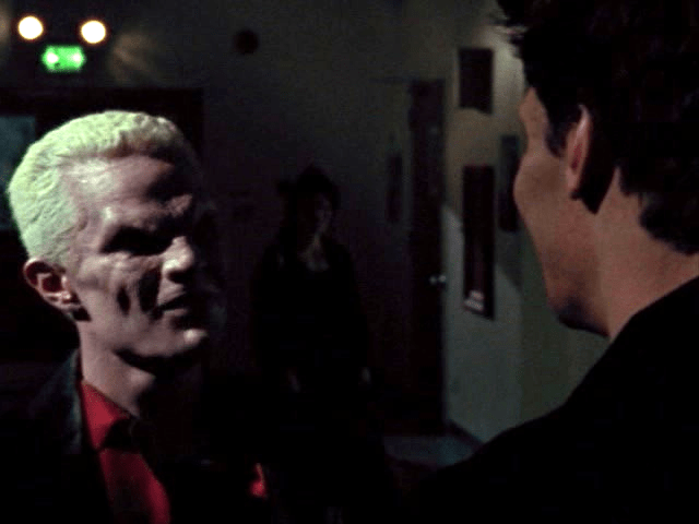 14:31 : Spike watches Buffy in the crowd, observing her move, like a predator. This is all James Marsters, who upon reading the script decided that Spike would be obsessed with the Slayer and stalk her as such, both in a violent and a sexual way. Worried the director wouldn’t like his take, James didn’t tell the producers he was doing it, but this decision led to so much more.