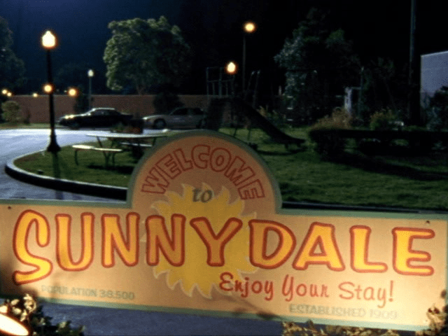 3:05 : The sign says that the population of Sunnydale is 38,500. This must be an estimation: 1) it never changes and 2) we cannot imagine someone updating it regularly. It also says the town of Sunnydale was founded in 1909. This fits with season three being the 100th anniversary of the town’s creation. Spike destroys the sign again in Lover’s Walk and a different one in Chosen.