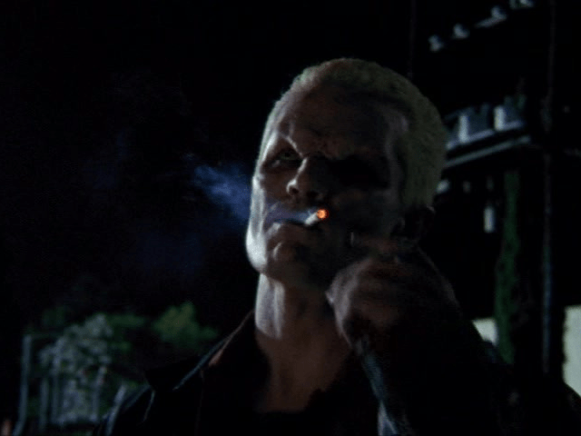 3:05 : And here he is: Spike arrives with an intense air of menace and danger. He’ll repeat this entrance in Lover’s Walk with a new slant. We must assume Dru is laying down, as you can’t see anyone other than Spike in the car. His introduction makes this the most important episode so far, other than Welcome to the Hellmouth, Angel and Prophecy Girl. After Buffy, he’s perhaps the most important character, not just in the series but the franchise as a whole, maybe more so than Angel himself. That debate continues amongst fandom to this day…